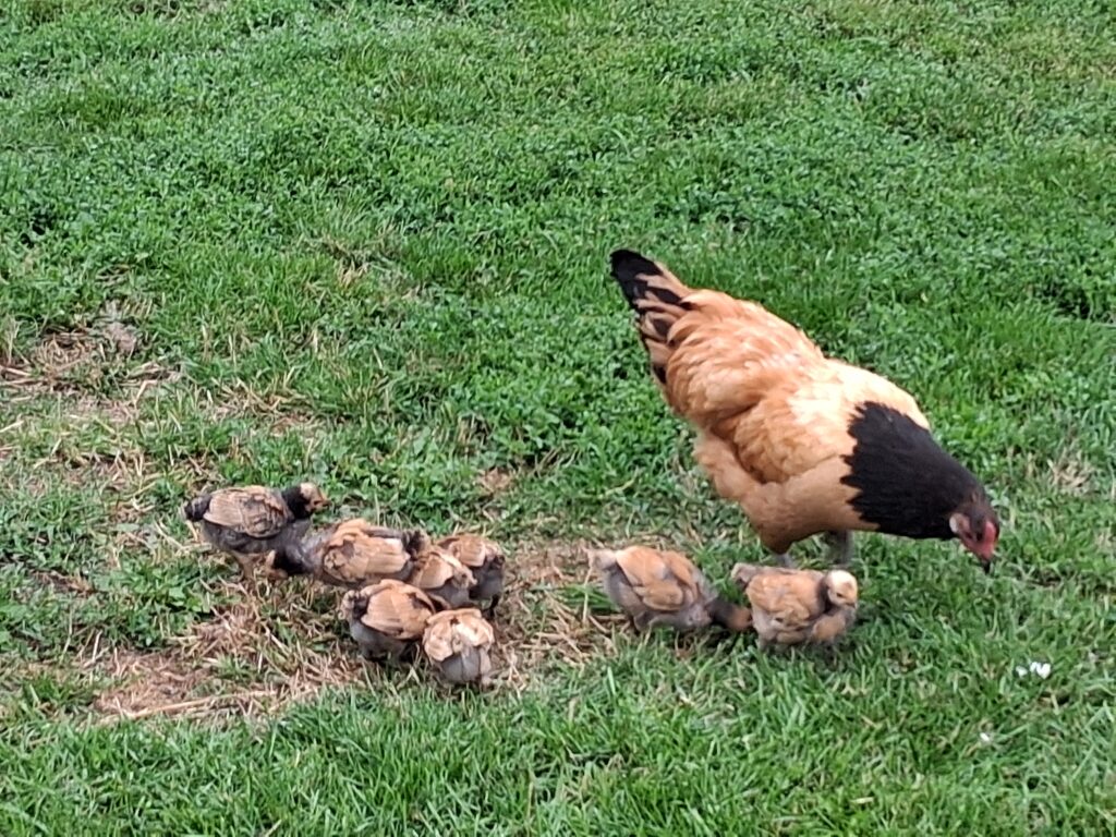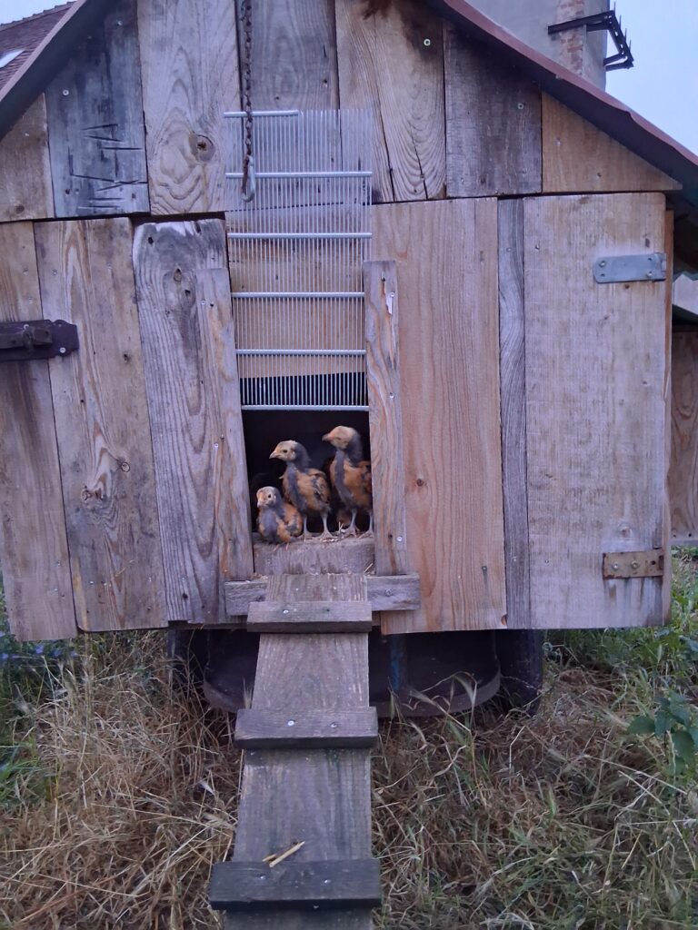 Im Juni setzte sich dann doch noch eine Glucke zum Brüten. Nach zwei Tagen gesellte sich allerdings eine zweite Glucke dazu. Alles schien friedlich.  Beide haben dann die 21 Tage gemeinsam in den sehr heißen Tagen, ohne Pause, auf dem Nest gesessen. Einen Tag nach dem ersten Schlüpfen wurde eine Glucke mit den Küken entnommen. Die zweite zog dann einen Tag später aus dem Nest. Leider war nur noch ein Küken geschlüpft. Nach 3 Wochen leben noch 8 Küken, die alle bei einer der Glucke sind.
