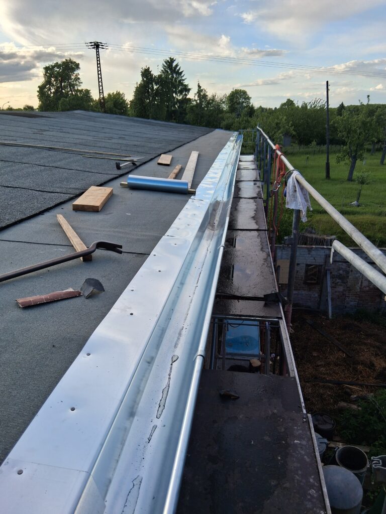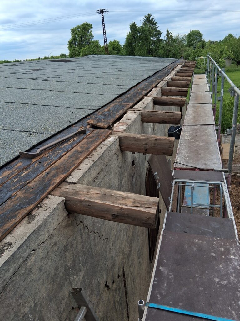 Da die Dachrinne wohl schon ca. 30 Jahre nicht mehr vorhanden war, wurde der Baukörper am Fuße durch Regen und Feuchtigkeit, hier besonders in der Frostperiode, schon stark in Mitleidenschaft gezogen. Ein Teile der alten Dachpappe musste aufwendig entfernt werden, um die Balkenköpfe welche teilweise verfault waren, reparieren zu können.