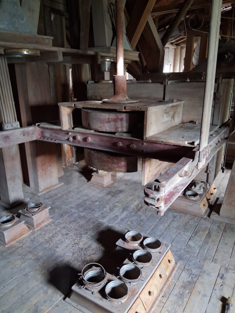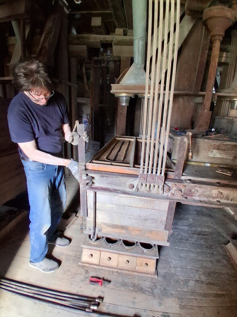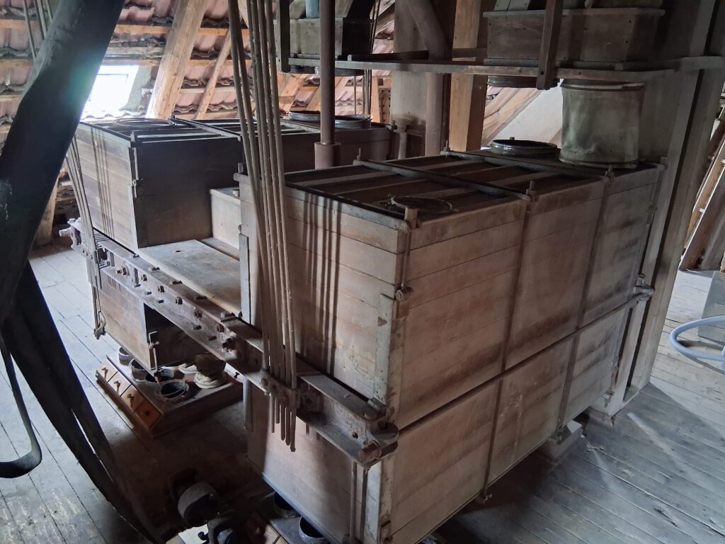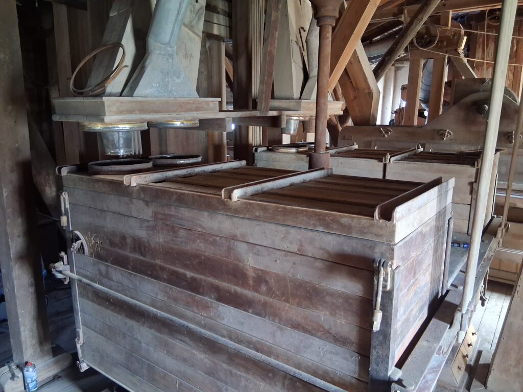 An einem Vormittag setzten wir ihn dann wieder Kasten für Kasten zusammen und verspannten ihn. Beim Zusammenbau erläuterte mir Thomas die Funktionsweise. Ich war verblüfft, wie ausgeklügelt diese Maschine ist und welche Einstellmöglichkeiten sie bot – eine unglaubliche Flexibilität in der Mahltechnologie. Ingenieurskunst schon vor über hundert Jahren, mit überwiegend Holz als Material und nur wenig Metall. Das Prinzip bleibt heute im Wesentlichen dasselbe, nur in größeren Dimensionen.