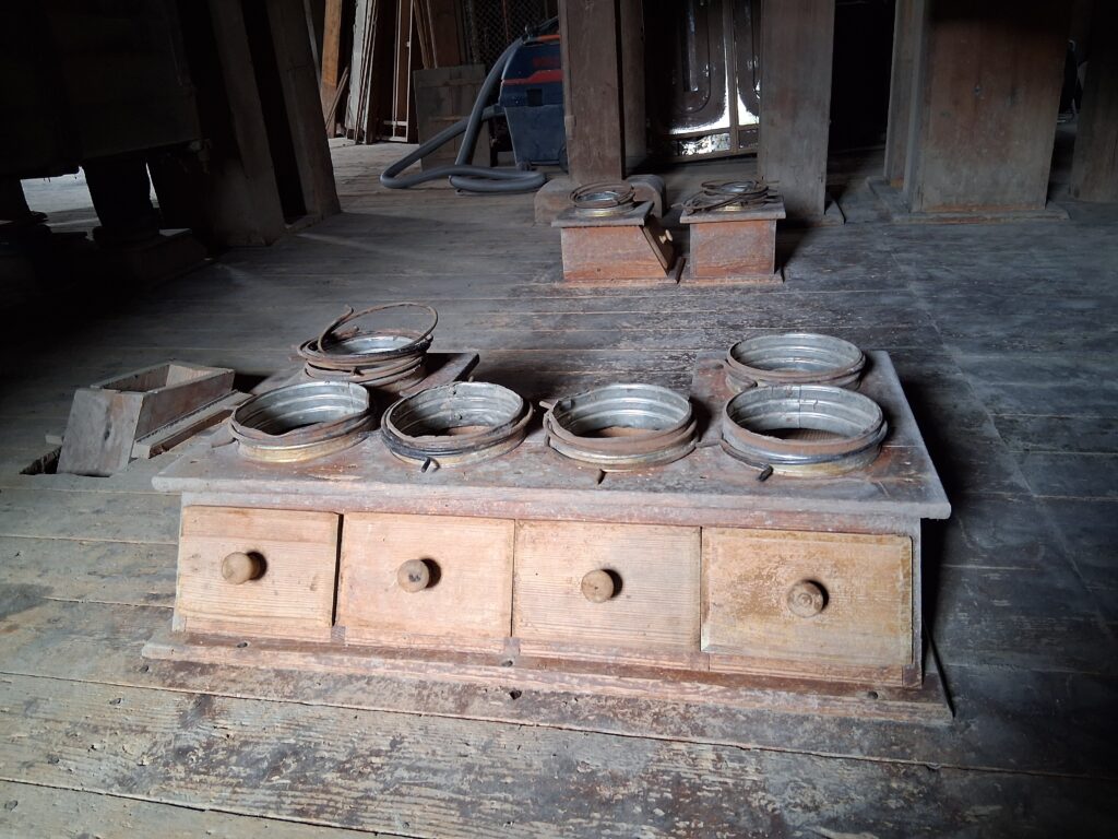 Einer der Plansichter war auseinandergebaut. Die einzelnen Teile lagen vermutlich seit über 50 Jahren in einer Ecke. Thomas meinte, diesen sollte man wieder zusammenbauen. Gesagt, getan. Vor dem Zusammenbau mussten der Plansichter selbst und die Anbauteile von oft Zentimeter dicker Staub- und Mehl-Schicht befreit werden. Wie viele Eimer davon gefüllt wurden, weiß ich nicht mehr.