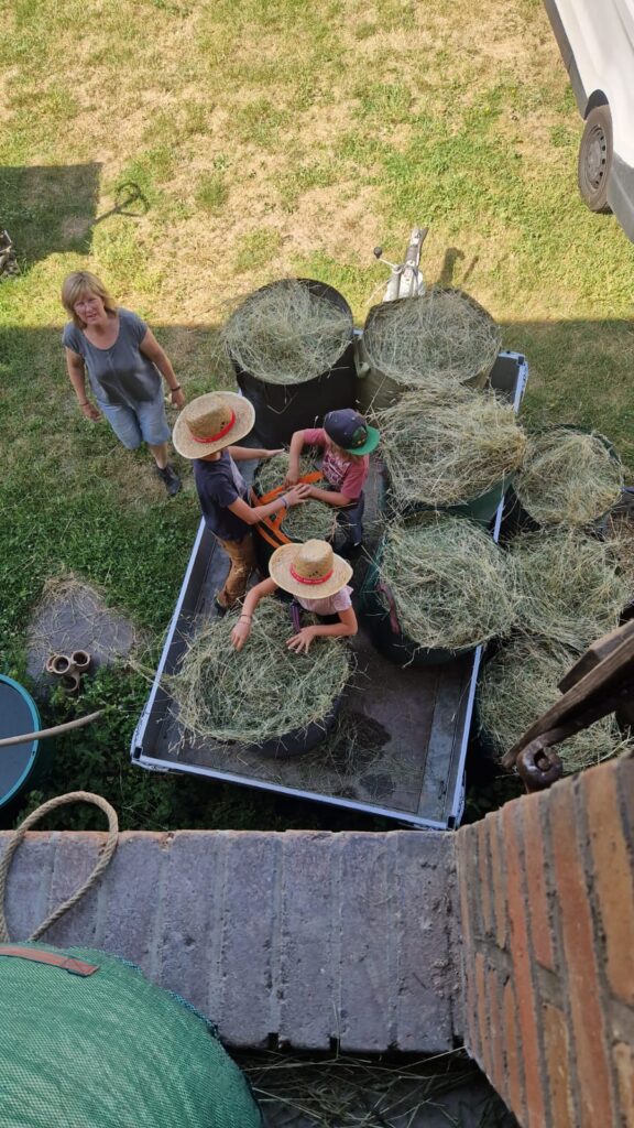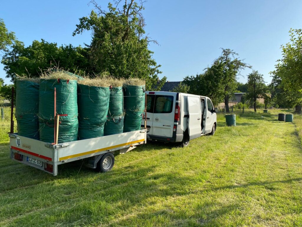 Nach der Feststellung das gekauftes Heu nicht das Beste ist, konnte dieses Jahr mehr Heu auf der Obstplantage gemacht werden. Wir entschieden uns für die Lagerung in grüne Kunstoffsäcke, die noch zahlreich nachgeordert werden mussten.