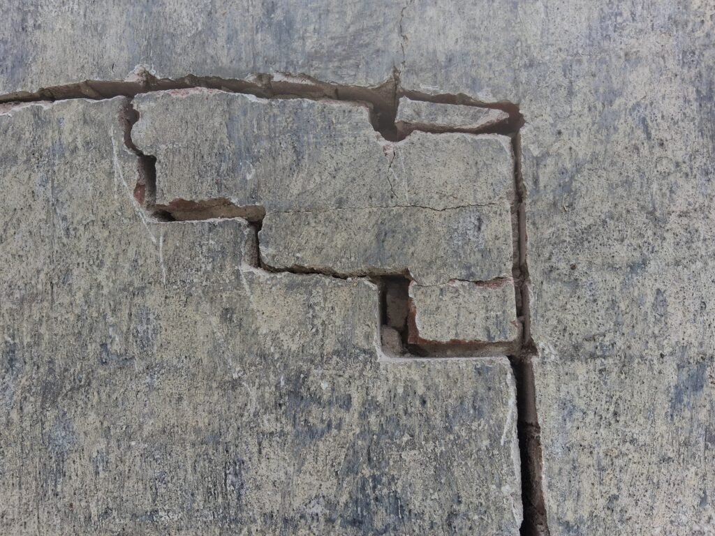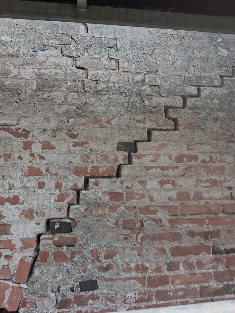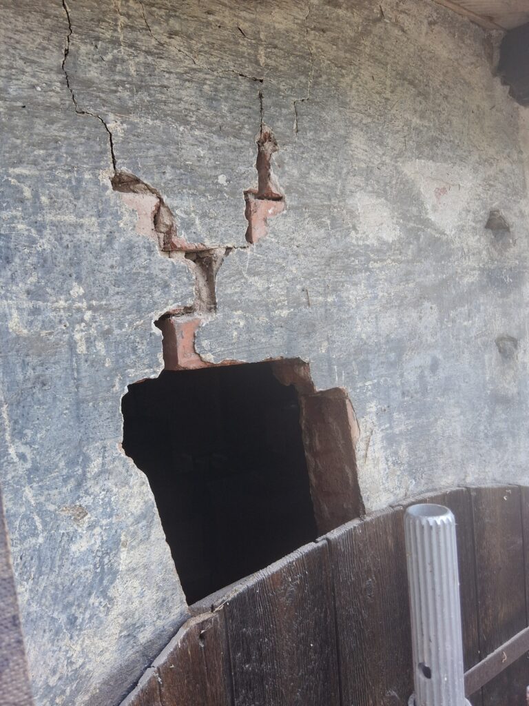 Da einmal die Rüstung stand, bot es sich an, die enormen Risse in der Wand zu schliessen.  Grund dafür ist der Untergrund aus Schwemmlöss der überwiegend aus Schluff, einer nicht bindigen Masse besteht. Bei verschiedenen Hochwassern war der Schluff dann offensichtlich so aufgeweicht, dass der Widerstand des Untergundes dem Gewicht des Baukörper nicht mehr standhalten konnte. Die Setzungserscheinungen im Gebäude mit einhergehenden Rissen ist im ganzen Objekt sichtbar.