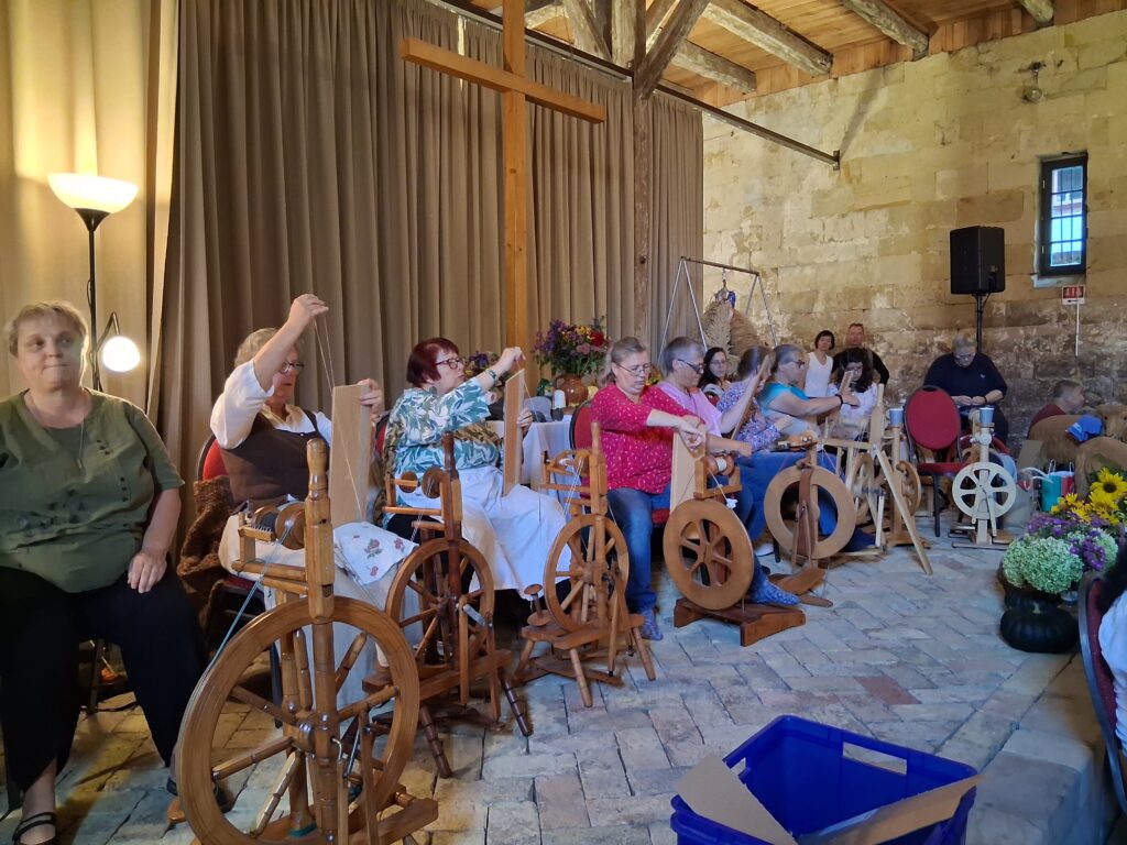 Im September fand die 26. sachsen-anhaltinische Meisterschaft im Schafwollspinnen statt. Austragungsort war erneut Langenstein. Zum ersten Mal nahm ich selbst am Wettbewerb teil. Unter den 26 Spinnenden war ich der einzige Mann. Aus 30 g Wolle vom Coburger Fuchsschaf sollte ein möglichst langer Faden gesponnen werden. Dafür standen zwei Stunden Zeitvorgabe bereit. Am Ende belegte ich mit 213 Metern den 5. Platz.