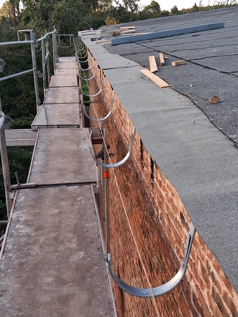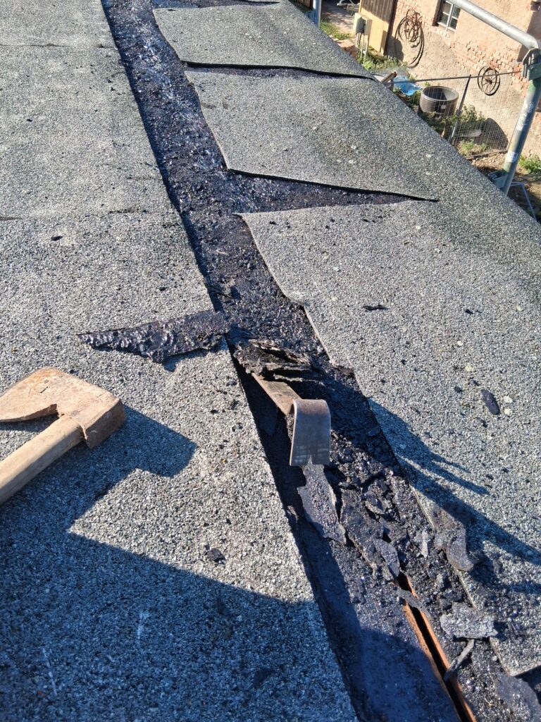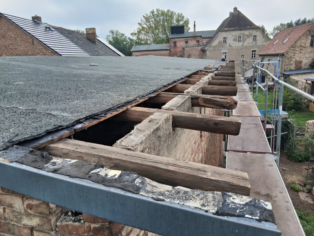 Die Arbeiten begannen mit der Entfernung eines ein Meter breiten Streifens mehrlagiger Dachpappe. Der damit verbundene Aufwand lässt sich kaum in Worte fassen: Teilweise waren bis zu fünf Lagen Teerpappe mit der Schalung verwachsen. Danach wurde die Schalung erneuert und die Balkenköpfe repariert. Danach konnten die neuen Rinneisen gesetzt werden.