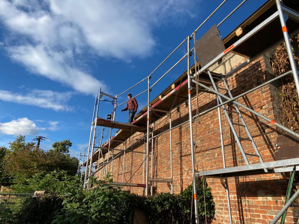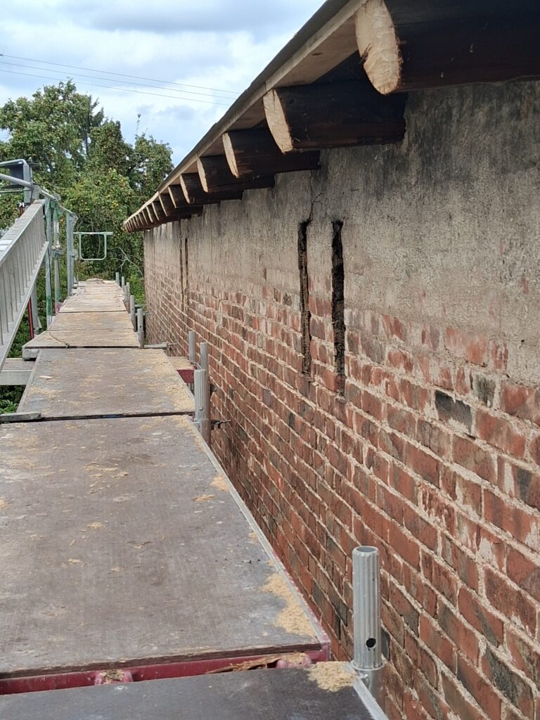 Mitte August gab es Urlaub. Drei volle Wochen sollten nun der anderen Stallseite zugutekommen. Nach Jahrzehnten erhielt auch die Dachseite endlich wieder eine Dachrinne. Eine Woche zuvor stand die Rüstung mit Hilfe von Thomas. Für die 17 Meter reichten die Ständer und Einhänge gerade so.